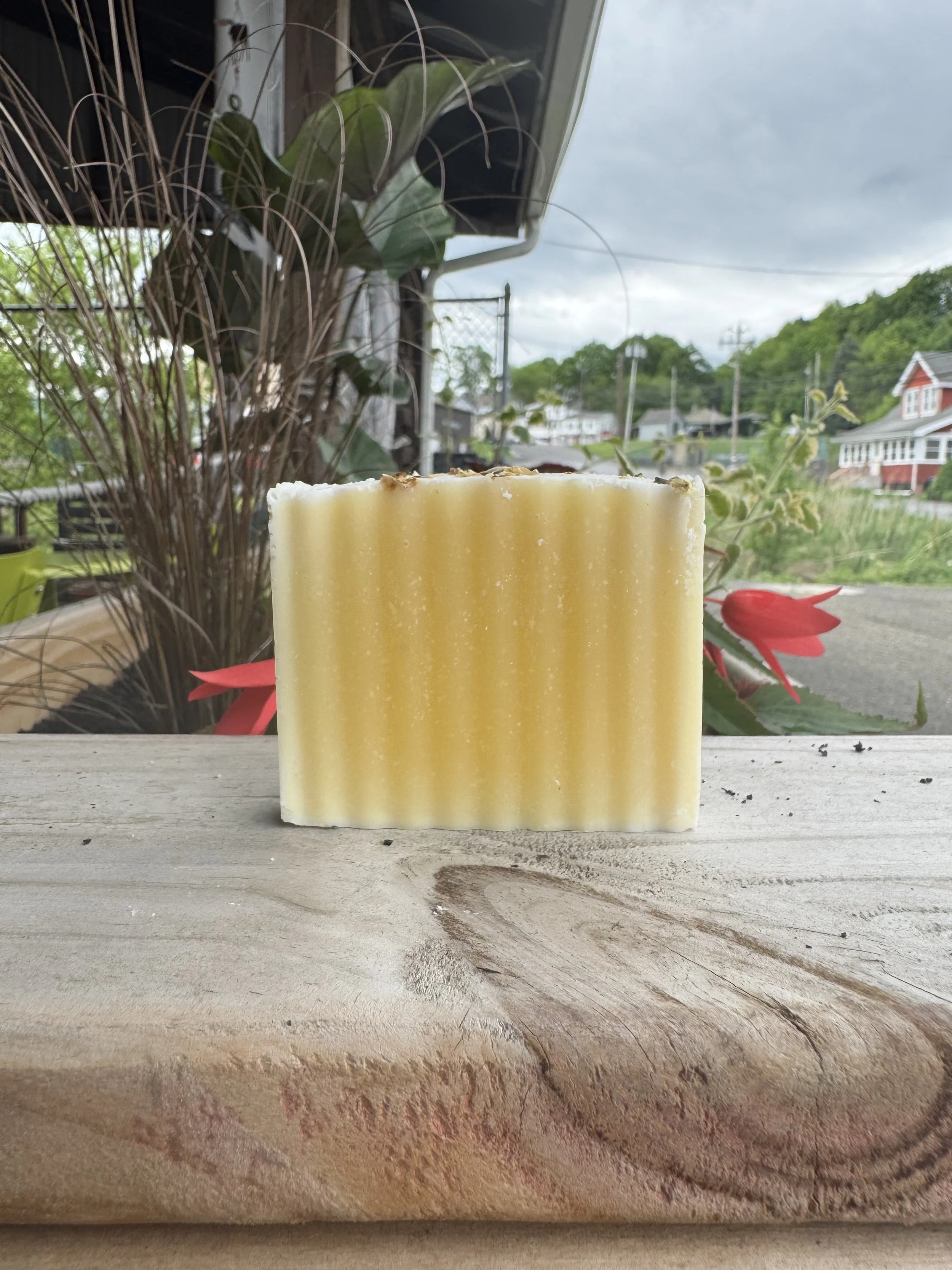 The bright yellow from this soap comes from olive oil infused with calendula flowers from the farm. It is topped with dried petals.